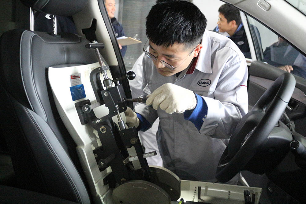“汽車駕駛員前方視野A柱雙目障礙角的測(cè)量”要求選手測(cè)量與計(jì)算A柱雙目障礙角,考察了選手的設(shè)備操作準(zhǔn)確性與熟練度。項(xiàng)目包含試驗(yàn)前準(zhǔn)備、三維H點(diǎn)裝置安裝、乘坐位置H點(diǎn)確認(rèn)三個(gè)環(huán)節(jié)。參賽選手分工明確,有條不紊,保證試驗(yàn)安全操作的情況下進(jìn)行比賽,評(píng)委們本著“公開、公平、公正”的原則對(duì)選手們的實(shí)操成績(jī)進(jìn)行打分。